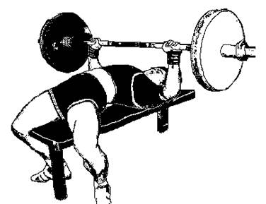 Ширина хвата влияет на высоту подъема штанги, и чем шире хват, тем меньшее расстояние проходит штанга. Конечно, это позволяет поднимать гораздо более серьезные веса, чем при выполнении жима лежа с узким хватом. Поэтому всегда старайтесь взяться достаточно широко. Но ширина хвата оказывает существенное влияние и на то, какие группы мышц будут участвовать в подъеме. Если локти при жиме лежа прижаты к корпусу, то максимально нагружены дельты и трицепс. Если локти максимально разведены, то нагружены грудные мышцы. Так как в момент съема штанги с груди (нижняя часть траектории) максимальная нагрузка ложится на грудные мышцы, то оптимальным будет такое положение локтей, в котором угол между корпусом и отведенным в сторону локтем будет составлять около 75 градусов. Кстати, этот угол позволит еще и более полно включить в процесс жима широчайшие мышцы спины. Если вы почитаете атлас анатомии, то увидите, что основная функция широчайших мышцы спины - приведение плеча к туловищу. Поэтому чем меньше будет угол между плечом и туловищем, тем меньше будет работать широчайшая. Чем больше разведены локти, тем больше это позволит использовать широчайшие мышцы спины в жиме. Более того, идеальным будет в момент опускания штанги на грудь РАЗВЕСТИ локти в стороны, а при начале движения вверх привести их к туловищу сокращением широчайших мышц. Помимо этого, на мой взгляд важно расположить руки таким образом, чтобы в момент самого мощного усилия предплечья были расположены перпендикулярно грифу штанги. Это позволит всю приложенную силу направить на подъем штанги. Ведь, если вспомнить физику, если мы направим силу немного под углом к грифу штанги, то вектор силы разобьется на две составляющие: одна идет на поднимание штанги вверх, а вторая вдоль оси грифа. Т.е. часть силы в этом случае тратится просто впустую. Кстати, если у вас во время жима лежа ладонь съезжает вдоль оси грифа в направлении блинов, это и означает, что у вас предплечье не перпендикулярно грифу штанги, и вы тратите часть силы не на подъем веса, а на перемещение своей ладони по грифу (слишком широкий хват). Исходя из всего сказанного я рекомендую пользоваться средним хватом и располагать руки так, чтобы предплечья были перпендикулярны грифу штанги (рис. 3.9).