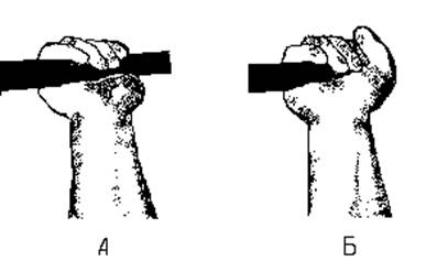 Положение рук во время жима - очень ответственный вопрос. Различают два хвата. На рисунке 3.11 изображены они оба. Первый, под буквой А – это открытый хват, его еще называют " обезьяним хватом", большой палец находиться за штангой. Второй, под буквой Б – закрытый хват, большой палец обхватывает штангу спереди. Конечно, мировые рекорды устанавливались обоими хватами, но все-таки эти хваты существенно различаются по степени безопасности. Открытый хват чрезвычайно опасен. Чрезвычайно! Я не один раз видел, как в конце тренировки, у спортсменов, выполняющих жим лежа с открытым хватом, штанга соскальзывала с мокрой ладони и падала на грудную клетку, шею или даже голову. Все дело в том, что в открытом хвате штанга не страхуется большим пальцем и свободно может выпасть из потных рук при каком-нибудь неловком движении или перехвате. Поэтому, если у вас нет травм, то всегда используйте закрытый хват, как на рисунке Б. Безопасность превыше всего. А если вы привыкли к открытому хвату – не теряйте времени и переучивайтесь. Это не займет много времени, зато подстрахует от неприятных и даже катастрофических неожиданностей.