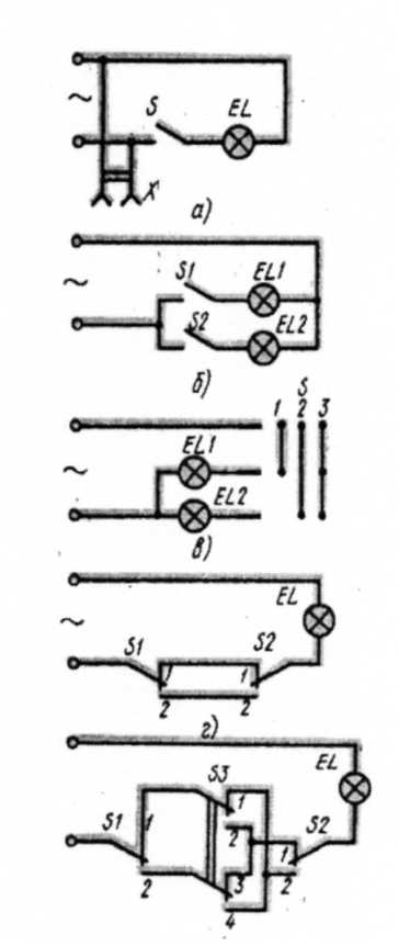 Рис.6. Принципиальные схемы включения: а) одной лампы с выключателем и штепсельной розеткой; б) двух ламп со своими выключателями; в) двух ламп с люстровым переключателем; г) одной лампой с управлением из двух мест; д) одной лампой с управлением из трех мест. Для освещения используют электрические лампы накаливания и газоразрядные лампы (в частности, люминесцентные), подключаемые к электрической сети выключателями, переключателями и через штепсельные розетки. Принципиальные схемы включения лампы EL с выключателем S, штепсельной розеткой X и двух ламп EL1 и EL2 со своими выключателями S1 и S2или люстровым переключателем S показаны на рис. 6, а—в. Принципиальные схемы включения лампы EL из двух мест и из любого числа мест (в частности, из трех) показаны на рис. 6, г, д. Схемы, показанные на рис. 6, а, б, элементарны и пояснений не требуют. Управление освещением по схеме, приведенной на рис. 6, в, осуществляется следующим образом. В исходном положении цепи ламп EL1 и EL2 разомкнуты. При переводе переключателя S в положение 1 замкнется его верхний контакт со средним, а следовательно, и цепь лампы EL1 и лампа загорится. При переводе переключателя S в положение 2 верхний контакт разомкнётся со средним и замкнется с нижним, лампа EL1 погаснет, a EL2 загорится. При переводе переключателя в положение 3 замкнутся все три контакта переключателя и загорятся обе лампы. Такие схемы используют для многоламповых светильников — люстр, поэтому переключатели для них часто называют люстровыми.