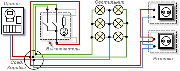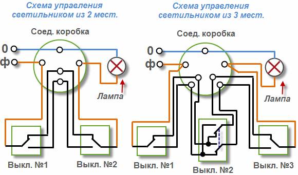Управление освещением из двух мест осуществляется с помощью переключателей S1 и S2 (рис. 6, г). В исходном состоянии переключатели S1 и S2 замыкают цепь лампы EL через верхний проводник, соединяющий их неподвижные контакты 1. При переключении одного из переключателей, например S1, разомкнётся цепь лампы EL. Если затем переключить переключатель S2, то цепь лампы EL замкнется, но через нижний проводник, соединяющий неподвижные контакты 2 обоих переключателей. Для управления освещением из трех мест (рис. 6, д) кроме двух переключателей S1 и S2 такой же конструкции, как на рис. 6, г, используют переключатель S3 другой конструкции. В исходном положении цепь лампы EL разомкнута. Можно заметить, что при переводе любого из трех переключателей в другое положение цепь лампы EL замкнется и она загорится. Если это будет переключатель S1, то цепь лампы EL замкнется через проводники, соединяющие контакты 2 переключателя S1 с контактом 3 переключателя S3 и его контакт 2 с контактом 1 переключателя S2. Такие схемы применяют для освещения коридоров, поэтому переключатели для них часто называют коридорными.