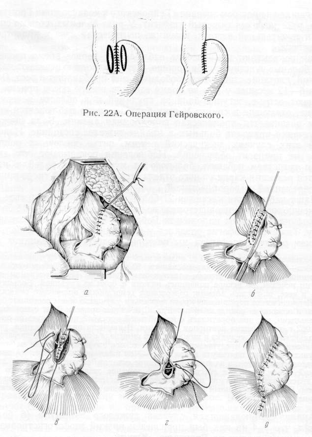 Консервативное лечение начинается со щадящей диеты (стол 1-1а), запрещения курить, употреблять острые блюда и пряности. Питание должно быть частым (до 5-6 раз в сутки). Особенно важно обеспечить больному психологический комфорт. Целесообразно применение местных анестетиков внутрь на ночь, нитропрепаратов, ганглиоблокаторов, церукала, седативных средств, витаминотерапии, физиотерапии. Иногда благоприятные результаты достигаются вагосимпатическими блокадами или курсами гипноза. Кардиодилатация – насильственное расширение кардии растяжением или разрывом циркулярной мускулатуры металическим, ртутным, гидростатическим и другими дилататорами. Показанием к кардиодилатации является – неэффективность консервативного лечения АК 2 ст. Хирургический метод лечения применяется лишь у 15-20% больных АК, обычно в 4 ст. В настоящее время распространены операции Венделя (рис.12), Геллера (эзофагокардиомиотомия, рис.13), операция Гейровского (эзофагофундоанастомоз, рис.14), резекция кардии и др.