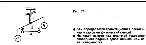 Эта сила называется гравитационной (или силой всемирного тяготения). Силы тяготения всегда являются силами притяжения и направлены вдоль прямой, проходящей через взаимодействующие тела. Коэффициент пропорциональности G называется гравитационной постоянной. Закон всемирного тяготения установлен для тел, принимаемых за материальные точки, т. е. для таких тел, размеры которых малы по сравнению с расстоянием между ними. Если же размеры взаимодействующих тел сравнимы с расстоянием между ними, то эти тела надо разбить на точечные элементы, подсчитать по формуле (22.1) силы притяжения между всеми попарно взятыми элементами, а затем геометрически их сложить (проинтегрировать), что является довольно сложной математической задачей. Впервые экспериментальное доказательство закона всемирного тяготения для земных тел, а также числовое определение гравитационной постоянной G проведено английским физиком Г. Кавендишем (1731—1810). Принципиальная схема опыта Кавендиша, применившего крутильные весы, представлена на рис. 37. Легкое коромысло А с двумя одинаковыми шариками массой m =729 г подвешено на упругой нити В. На коромысле С укреплены на той же высоте массивные шары массой M =158 кг. Поворачивая коромысло С вокруг вертикальной оси, можно изменять расстояние между шарами с массами т и М. Под действием пары сил, приложенных к шарам т со стороны шаров М, коромысло А поворачивается в горизонтальной плоскости, закручивая нить В до тех пор, пока момент сил упругости не уравновесит момента сил тяготения. Зная упругие свойства нити, по измеренному углу поворота можно найти возникающие силы притяжения, а таккак массы шаров известны, то и вычислить значение G.