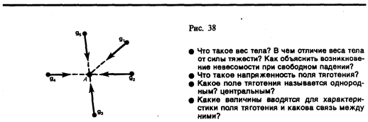 т. е. если тело покоится или движется прямолинейно и равномерно, то а=0 и P'=mg. Если тело свободно движется в поле тяготения по любой траектории и в любом направлении, то a=g и Р' =0, т. е. тело будет невесомым. Например, невесомыми являются тела, находящиеся в космических кораблях, свободно движущихся в космосе. § 24. Поле тяготения и то напряженность Закон тяготения Ньютона определяет зависимость силы тяготения от масс взаимодействующих тел и расстояния между ними, но не показывает, как осуществляется это взаимодействие. Тяготение принадлежит к особой группе взаимодействий. Силы тяготения, например, не зависят от того, в какой среде взаимодействующие тела находятся. Тяготение существует и в вакууме. Гравитационное взаимодействие между телами осуществляется с помощью поля тяготения, или гравитационного поля. Это поле порождается телами и является формой существования материи. Основное свойство поля тяготения заключается в том, что на всякое тело массой т, внесенное в это поле, действует сила тяготения, т. е.