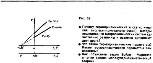В этих уравнениях t — температура по шкале Цельсия, р 0 и V 0 — давление и объем при 0°С, коэффициент a = 1/273, 15 К–1. Процесс, протекающий при постоянном давлении, называется изобарным. На диаграмме в координатах V, t (рис. 61) этот процесс изображается прямой, называемой изобарой. Процесс, протекающий при постоянном объеме, называется изохорным. На диаграмме в координатах р, t (рис. 62) он изображается прямой, называемой изохорой. Из (41.2) и (41.3) следует, что изобары и изохоры пересекают ось температур в точке t=– 1 /a=– 273, 15°С, определяемой из условия 1+a t = 0. Если перенести начало отсчета в эту точку, то происходит переход к шкале Кельвина (рис. 62), откуда