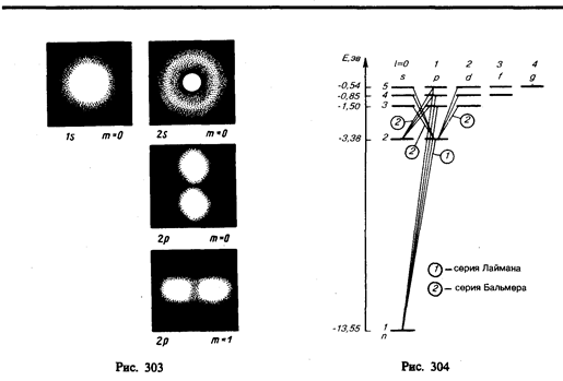 Квантовые числа и их значения являются следствием решений уравнений Шредингера и условий однозначности, непрерывности и конечности, налагаемых на волновую функцию y. Кроме того, так как при движении электрона в атоме существенны волновые свойства электрона, то квантовая механика вообще отказывается от классического представления об электронных орбитах. Согласно квантовой механике, каждому энергетическому состоянию соответствует волновая функция, квадрат модуля которой определяет вероятность обнаружения электрона в единице объема. Вероятность обнаружения электрона в различных частях атома различна. Электрон при своем движении как бы «размазан» по всему объему, образуя электронное облако, плотность (густота) которого характеризует вероятность нахождения электрона в различных точках объема атома. Квантовые числа п и l характеризуют размер и форму электронного облака, а квантовое число ml характеризует ориентацию электронного облака в пространстве. В атомной физике, по аналогии со спектроскопией, состояние электрона, характеризующееся квантовыми числами l= 0, называют s -состоянием (электрон в этом состоянии называют s -электроном), l =1 — p -состоянием, l= 2 — d -состоянием, l =3 — f -состоянием и т. д. Значение главного квантового числа указывается перед условным обозначением орбитального квантового числа. Например, электроны в состояниях n =2 и l =0 и 1 обозначаются соответственно символами 2 s и 2 р. На рис. 303 для примера приведено распределение электронной плотности (формы электронного облака) для состояний атома водорода при n =1 и п= 2, определяемое | 3. Спектр. Квантовые числа n, l и ml позволяют более полно описать спектр испускания (поглощения) атома водорода, полученный в теории Бора (см. рис. 294). В квантовой механике вводятся правила отбора, ограничивающие число возможных переходов электронов в атоме, связанных с испусканием и поглощением света. Теоретически доказано и экспериментально подтверждено, что для дипольного излучения электрона, движущегося в центрально-симметричном поле ядра, могут осуществляться только такие переходы, для которых: 1) изменение орбитального квантового числа D l удовлетворяет условию