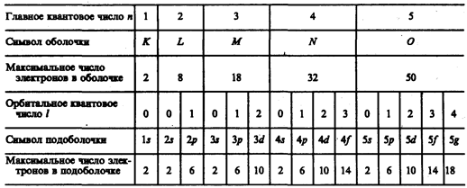 Совокупность электронов в многоэлектронном атоме, имеющих одно и то же главное квантовое число n, называют электронной оболочкой. В каждой из оболочек электроны распределяются по подоболочкам, соответствующим данному l. Поскольку орбитальное квантовое число принимает значения от 0 до n –1, число подоболочек равно порядковому номеру n оболочки. Количество электронов в подоболочке определяется магнитным и магнитным спиновым квантовыми числами: максимальное число электронов в подоболочке с данным l равно 2(2 l +1). Обозначения оболочек, а также распределение электронов по оболочкам и подоболочкам представлены в табл. 6. Таблица 6
