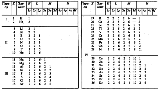 Распределение электронов в атоме подчиняется принципу Паули, который может быть использован в его простейшей формулировке: в одном и том же атоме не может быть более одного электрона с одинаковым набором четырех квантовых чисел п, l, ml и тs т. е.