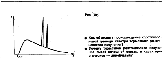 § 229. Рентгеновские спектры Большую роль в выяснении строения атома, а именно распределения электронов по оболочкам, сыграло излучение, открытое в 1895 г. немецким физиком В. Рентгеном (1845—1923) и названное рентгеновским. Самым распространенным источником рентгеновского излучения является рентгеновская трубка, в которой сильно ускоренные электрическим полем электроны бомбардируют анод (металлическая мишень из тяжелых металлов, например W или Pt), испытывая на нем резкое торможение. При этом возникает рентгеновское излучение, представляющее собой электромагнитные волны с длиной волны примерно 10–12—10–8 м. Волновая природа рентгеновского излучения доказана опытами по его дифракции, рассмотренными в § 182. Исследование спектрального состава рентгеновского излучения показывает, что его спектр имеет сложную структуру (рис. 306) и зависит как от энергии электронов, так и от материала анода. Спектр представляет собой наложение сплошного спектра, ограниченного со стороны коротких длин волн некоторой границей lmin, называемой границей сплошного спектра, и линейчатого спектра — совокупности отдельных линий, появляющихся на фоне сплошного спектра.