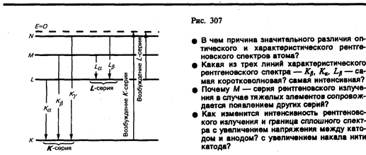 Рассмотрение структуры и особенностей характеристических рентгеновских спектров приводит к выводу, что их возникновение связано с процессами, происходящими во внутренних, застроенных электронных оболочках атомов, которые имеют сходное строение. Разберем механизм возникновения рентгеновских серий, который схематически показан на рис. 307. Предположим, что под влиянием внешнего электрона или высокоэнергетического фотона вырывается один из двух электронов K -оболочки атома. Тогда на его место может перейти электрон с более удаленных от ядра оболочек L, M, N,.... Такие переходы сопровождаются испусканием рентгеновских квантов и возникновением спектральных линий К- серии: Кa (L ® K), Kb (M ® K), Kg (N ® K) и т. д. Самой длинноволновой линией К- серии является линия Ka. Частоты линий возрастают в ряду Ka ® Kb ® Kg, поскольку энергия, высвобождаемая при переходе электрона на K -оболочку с более удаленных оболочек, увеличивается. Наоборот, интенсивности линий в ряду Ka ® Kb ® Kg убывают, так как вероятность переходов электронов с L -оболочки на K -оболочку больше, чем с более удаленных оболочек М и N. К- серия сопровождается обязательно другими сериями, так как при испускании ее линий появляются вакансии в оболочках L, M,..., которые будут заполняться электронами, находящимися на более высоких уровнях.