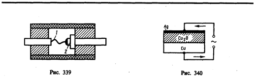 § 250. Полупроводниковые диоды и триоды (транзисторы) Односторонняя проводимость контактов двух полупроводников (или металла с полупроводником) используется для выпрямления и преобразования переменных токов. Если имеется один электронно-дырочный переход, то его действие аналогично действию двухэлектродной лампы—диода (см. §105). Поэтому полупроводниковое устройство, содержащее один p-n -переход, называется полупроводниковым (кристаллическим) диодом. Полупроводниковые диоды по конструкции делятся на точечные и плоскостные. В качестве примера рассмотрим точечный германиевый диод (рис. 339), в котором тонкая вольфрамовая проволока 1 прижимается к п -германию 2 остриём, покрытым алюминием. Если через диод в прямом направлении пропустить кратковременный импульс тока, то при этом резко повышается диффузия Аl в Gе и образуется слой германия, обогащенный алюминием и обладающий p -проводимостью. На границе этого слоя образуется p-n -переход, обладающий высоким коэффициентом выпрямления. Благодаря малой емкости контактного слоя точечные диоды применяются в качестве детекторов (выпрямителей) высокочастотных колебаний вплоть до сантиметрового диапазона длин волн. Принципиальная схема плоскостного меднозакисного (купоросного) выпрямителя дана на рис. 340. На медную пластину с помощью химической обработки наращивается слой закиси меди Сu2О, который покрывается слоем серебра. Серебряный электрод служит только для включения выпрямителя в цепь. Часть слоя Сu2О, прилегающая к меди и обогащенная ею, обладает электронной проводимостью, а часть слоя Сu2О, прилегающая к Ag и обогащенная (в процессе изготовления выпрямителя) кислородом, — дырочной проводимостью. Таким образом, в толще закиси меди образуется запирающий слой с пропускным направлением тока от Сu2О к Сu (p ® n). Технология изготовления германиевого плоскостного диода описана в § 249 (см. рис. 325). Распространенными являются также селеновые диоды и диоды на основе арсенида галлия и карбида кремния. Рассмотренные диоды обладают рядом преимуществ по сравнению с электронными лампами (малые габаритные размеры, высокие к.п.д. и срок службы, постоянная готовность к работе и т. д.), но они очень чувствительны к температуре, поэтому интервал их рабочих температур ограничен (от –70 до +120°С). p-n -Переходы обладают не только прекрасными выпрямляющими свойствами, но могут быть использованы также для усиления, а если в схему ввести обратную связь, то и для генерирования электрических колебаний. Приборы, предназначенные для этих целей, получили название полупроводниковых триодов или транзисторов (первый транзистор создан в 1949 г. американскими физиками Д. Бардином, У. Браттейном и У. Шокли; Нобелевская премия 1956 г.). Для изготовления транзисторов используются германий и кремний, так как они характеризуются большой механической прочностью, химической устойчивостью и большей, чем в других полупроводниках, подвижностью носителей тока. Полупроводниковые триоды делятся на точечные и плоскостные. Первые значительно усиливают напряжение, но их выходные мощности малы из-за опасности перегрева (например, верхний предел рабочей температуры точечного германиевого триода лежит в пределах 50—80°С). Плоскостные триоды являются более мощными. Они могут быть типа р-п-р и типа п-р-п в зависимости от чередования областей