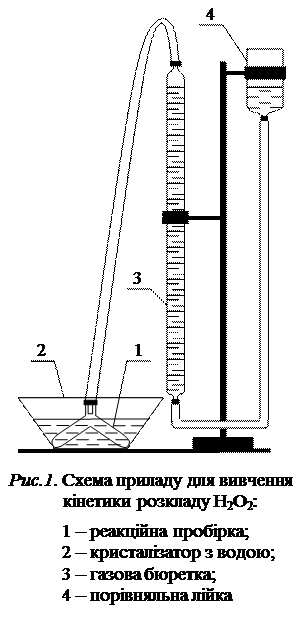 Мета роботи: визначити газометричним методом порядок реакції розкладу пероксиду водню у водному розчині та дослідити вплив концентрації каталізатора КІ на швидкість цього процесу. Пероксид водню у водному розчині самочинно повільно розкладається за рівнянням: 2Н2O2 = 2Н2O + О2 . (1.14) Наявність у розчині деяких сполук, які є каталізаторами, значно прискорює цей процес. За перебігом реакції спостерігають, вимірюючи через певні проміжки часу від початку реакції об’єм кисню, що виділяється (газометричний метод). Схему приладу для дослідження кінетики реакції (1.14) зображено на рис. 1. Порівняльну лійку 4 спочатку закріплюють у штативі так, щоб рівень води у газовій бюретці 3 був на ~ 2 – 2, 5 см вище за позначку " 0". В окремі коліна реакційної пробірки 1 наливають піпетками зазначені викладачем об’єми розчинів пероксиду водню та каталізатора – водного розчину KI. Щільно закривають пробірку пробкою, яка сполучена гумовою трубкою з газовою бюреткою. Рівень води у газовій бюретці незначно знизиться. Пробірку занурюють у кристалізатор з водою 2, який виконує роль термостата. Нахиляючи пробірку, змішують розчини пероксиду водню та каталізатора так, щоб їх суміш повністю опинилась в одному з її колін. Після насичення розчину киснем, який утворюється внаслідок розкладу Н2О2, газ почне виділятися з пробірки, і рівень води в газовій бюретці знижуватиметься.