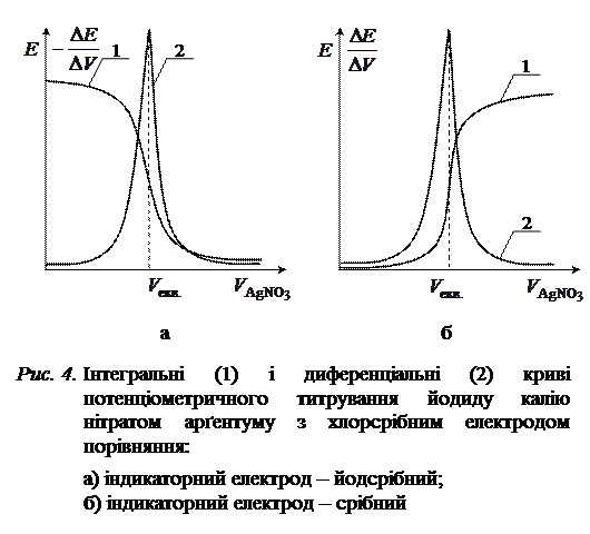 Мета роботи: визначити молярну концентрацію водного розчину електроліту потенціометричним методом. Потенціометричне титрування використовують у разі визначення концентрації забарвлених або каламутних розчинів, де неможливе застосування кольорових індикаторів, а також для визначення вмісту окремих компонентів у сумішах кислот або основ, константи дисоціації яких відрізняються не менш, ніж на три порядки, і у сумішах електролітів, які внаслідок додавання титранту утворюють осади з суттєво різними добутками розчинності. Для визначення концентрації досліджуваного розчину складають гальванічний елемент з двох електродів: електрода порівняння, потенціал якого залишається сталим у процесі титрування, та індикаторного електрода, потенціал якого залежить від концентрації (активності) іонів, що входять до складу утвореного внаслідок додавання титранту осаду або слабкого електроліту. Еквівалентний об’єм визначають за графічними залежностями Якщо індикаторний електрод в ГЕ є катодом, то його потенціал і ЕРС ГЕ внаслідок додавання титранту згідно з (4.1) змінюються однаково (або зростають, або спадають). У випадку, коли індикаторний електрод є анодом у ланцюгу, його потенціал та ЕРС ГЕ змінюються протилежно (якщо Наприклад, якщо розчин KI титрувати розчином AgNO3, то перебігає реакція: