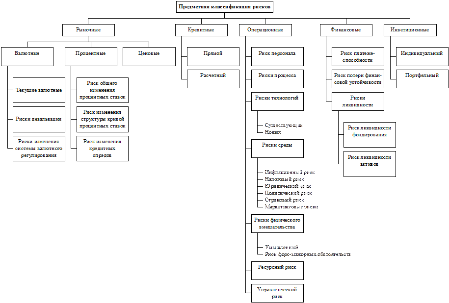 Рис. 8.2. Предметная классификация рисков инвестирования инновационного проекта Риск общего изменения процентных ставок – риск роста или падения процентных ставок на все вложения в одной или нескольких валютах, вне зависимости от их срочности и кредитного рейтинга. Риск изменения структуры кривой процентных ставок – риск изменения ставок на более короткие вложения по сравнению с более длинными (или наоборот), возможно не связанного с изменением общего уровня процентных ставок; Риск изменения кредитных спрэдов – риск изменения ставок на вложения с определёнными кредитными рейтингами по сравнению со ставками на вложения с иными рейтингами, возможно не связанного с изменением общего уровня процентных ставок. Ценовой риск – риски потерь, вызванных неблагоприятным изменением тех или иных ценовых индексов, корпоративные ценные бумаги (например, цен на нефть или индексов цен акций). Кредитный риск – риск потерь, связанных с ухудшением состояния дебитора, контрагента по сделке, эмитента ценных бумаг, риск неисполнения дебитором или контрагентом по сделке своих обязательств перед организацией, т.е. риск возникновения дефолта дебитора или контрагента. Под ухудшением состояния (рейтинга) понимается, как ухудшение финансового состояния дебитора, так и ухудшение деловой репутации, позиций среди конкурентов в регионе, отрасли, снижение способности успешно завершить некий конкретный проект и т.д., т.е. все факторы способные повлиять платежеспособность дебитора. прямой к редитный риск – риск сделок прямого и не прямого кредитования Расчетный кредитный риск – риск сделок купли/продажи активов без предоплаты со стороны контрагента и гарантий расчётов со стороны третьих лиц. Риск ликвидности фондирования (привлечения денежных средств) связан со снижением способности финансировать принятые позиции по сделкам, когда наступают сроки их ликвидации, покрывать денежными ресурсами требования контрагентов, а также требования обеспечения – т.е. со снижением платежеспособности организации. Риск ликвидности активов – невозможность ликвидировать активы на различных сегментах рынка. Риск ликвидности активов может быть охарактеризован периодом времени, за который банк может ликвидировать свои позиции на рынке, не влияя при этом на рыночные цены. Операционный риск – риск прямых или косвенных потерь, вызванных недостатками в организации работы предприятия. Риск персонала – риск потерь, вызванных постоянной непредсказуемостью в отношении характера, состояния здоровья и поведения человека. Риск процесса – риск потерь, связанный с ошибками в процессах проведения операций и расчетов по ним, их учета, отчетности, ценообразования и т.д. Риск технологий – риск потерь, обусловленных несовершенством используемых технологий. Риск существующих технологий – риск потерь ввиду несоответствия имеющихся возможностей производства современным требованиям. Риск новых технологий – риск слишком раннего (к их использованию и применению могут оказаться неподготовленными потребители продукции, организации-смежники, сбытовые торговые организации и т.д.) или слишком позднего внедрения инновационных технологий. Риски среды – риски потерь, связанные с нефинансовыми изменениями в среде, в которой действует организация. Риски физического вмешат
