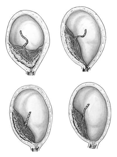 Рис. 24.1. Варианты предлежания плаценты.А - полное; Б - боковое (неполное, частичное); В - краевое (неполное); Г - низкое прикрепление плаценты Вариант предлежания плаценты во время беременности определяется с помощью УЗИ. По данным трансвагинальной эхографии в настоящее время выделяют четыре степени предлежания плаценты (рис. 24.2):