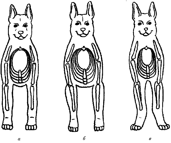 Постав передних конечностей: а – правильный постав передних конечностей при хорошо сформированной грудной клетке; б – косолапость, обусловленная бочкообразной грудной клеткой и вывернутыми наружу локтями и плечами; в – суженная грудная клетка и сближенные локти: наблюдается неправильный постав передних конечностей, а также недостаток места для нормального развития внутренних органов ? Задние конечности У немецкой овчарки задние конечности испытывают меньшую нагрузку, чем передние, хотя и выполняют сходные функции. Основное действие задних конечностей сводится к выталкиванию тела собаки вперед при ходьбе и беге наподобие мощной пружины. Они крепятся к расположенному ниже крестца наружному краю тазового пояса. Каждая из задних конечностей состоит из бедра, голени, плюсны и лапы. Так как на них приходится основная двигательная нагрузка, задние конечности должны быть пропорциональных размеров, с тупыми углами в сочленениях и хорошо омускулены. При осмотре немецкой овчарки сзади по стандарту задние конечности должны быть прямыми, поставленными параллельно на достаточном расстоянии друг от друга. Сочленение головки бедренной кости с углублением у нижнего края таза образует тазобедренный сустав. По стандарту таз должен располагаться не перпендикулярно к спине, а под наклоном, чтобы обеспечить плавное движение тела собаки вперед, которое происходит при передаче давления через наклонный таз по крестцу в позвоночный столб. При неправильном положении тазовых костей собака приобретает подпрыгивающую походку, при которой зад поднимается вверх при каждом шаге.