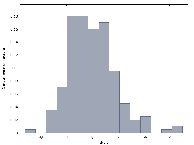 Осадка большинства яхт находится в диапазоне от 0, 6 до 2, 6 метров. Однако есть несколько яхт, осадка которых меньше 0, 5 метров или больше 2, 75 метров, поэтому их придется исключить из модели.