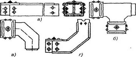 Рис. 1.5.2. Стальные электрические короба серии У а —прямой; б—тройниковый; в —угловой для измерения трассы в горизонтальной плоскости; г —угловой для изменения трассы в вертикальной плоскости.