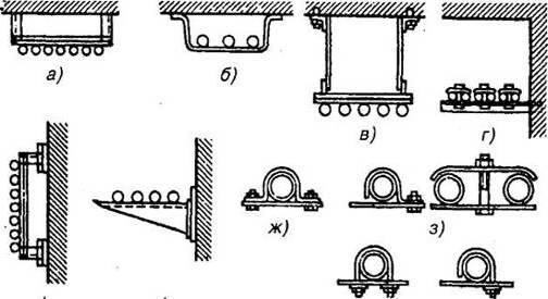 Рис. 1.6.2. Способы крепление труб к опорным конструкциям а —в —потолочных опорных конструкций из уголка, перфорированной полосы и на подвесках; г - настенных опорных конструкций и кронштейнов; ж - хомутов, полухомутов и двух однолапковых скоб и накладок.