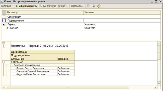 Отчет, представленный на рисунке 26, формируется на основе данных справочника «Сотрудники организации», перечисления «Вид инструктажа», необходим для регистрации разных видов инструктажей.