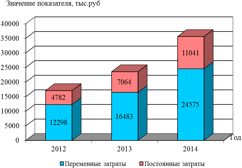 Анализируя данные таблицы2, можно сделать вывод: в отчетном периоде снизилась оплата труда на 49, 8 % по сравнению с 2013 годом. Объем материальных затрат за рассматриваемый период увеличился на 30, 7% и 57, 1% в 2013-2014 гг. соответственно. За счет приобретения некоторого оборудования амортизационные отчисления увеличились на 1, 2% в 2013 году и на 43, 2% в 2014 году. Прочие затраты составляют в структуре себестоимости значительный вес. За период прочие затраты увеличились без малого на 100%. Наблюдается рост как переменных, так и постоянных затрат. Рост постоянных затрат составил 47, 7% и 56, 3% в 2013-2014 годах соответственно. Полная себестоимость в 2014 году составила 35616 тыс.руб. против 17080 тыс.руб. в 2012 году. Соответственно в 2013-2014 годах полная себестоимость увеличилась на 37, 9% и на 51, 3%. На рисунке представлена динамика постоянных и переменных затрат ЗАО «Ирбис» в 2012-2014 годах.