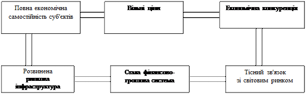 Контрольна функція ринку визначає суспільну значущість виробленого продукту та витраченої на його виготовлення праці. Розподільча функція ринку встановлює необхідні відтворювальні пропозиції, забезпечує збалансованість економіки, диференціює доходи товаровиробників, виявляє переможців та переможених. Стимулююча функція ринку сприяє заохоченню тих, хто найбільш раціонально використовує фактори виробництва для одержання найкращих остаточних результатів, спонукає зростання продуктивності праці, використовування нової техніки тощо. Тобто ринокповертає економіку обличчям до потреб людей, робить всіх учасників конкурентного процесу матеріально зацікавленими у задоволенні цих потреб. Інформаційна функція ринку сповіщає про рівень ринкової кон'юнктури, цін, кредитних ставок, що залежать від змін кількості, асортименту, якості товарів і послуг. Інтегруюча функція ринку об'єднує економіку в одне ціле, розкриваючи систему горизонтальних і вертикальних зв'язків (підприємств, галузей, регіонів), у тому числі зовнішньоекономічних. Ринок сприяєпроникненню товарів у різні країни і куточки світу. В умовах формування в суспільстві системи ринкових відносин, що супроводжується на початковій стадії цього процесу зниженням ефективності матеріального виробництва, особливої актуальності набуває проблема докорінної зміни механізму управління економікою підприємства. Пізнання ринку неможливе без аналізу його структури, тобто елементів, з яких він складається і які взаємодіють між собою. Для цього слід обрати критерій, за яким можна розмежувати елементи ринку. Таких критеріїв може бути кілька, тому що ринок є складним і багатоманітним утворенням економічного життя. Так, з точки зору економічного призначення об'єктів ринкових відносин, ринок можна класифікувати як: ринок предметів споживання та послуг; ринок засобів виробництва; ринок науково-технічних розробок та інформації; ринок " ноу-хау"; ринок праці; ринок цінних паперів (фінансовий ринок); валютний ринок. Структура ринку може бути охарактеризована за адміністративно-територіальною ознакою або за географічним положенням: місцевий ринок; ринок окремих територій; ринок окремих регіонів; загальнонаціональний (внутрішній) ринок; світовий; ринок коаліцій різних країн (ЄС, СНД тощо). Ринок можна характеризувати залежно від ступеня розвиненості ринкових відносин: розвинутий ринок; ринок, що формується. Залежно від ступеня обмеження конкуренції розрізняють: монополістичний ринок; олігополістичний ринок; ринок вільної конкуренції (вільний ринок); змішаний ринок. За характером продажу розрізняють: оптовий ринок (ринок оптової торгівлі); роздрібний ринок (ринок роздрібної торгівлі). Формування ринкової економіки в Україні треба розпочинати з відтворення ринкових інститутів, які перебувають зараз у зародковому стані. Це має відбуватися за схемою, яка враховувала б економічні, політичні, історичні та психологічні чинники, характерні для нашої країни. Основними засадами ринку є: повна економічна самостійність суб'єктів господарювання; вільні ціни; економічна конкуренція; розвинена ринкова інфраструктура; стала фінансово-грошова система; тісний зв'язок зі світовим ринком (рис.2.2).