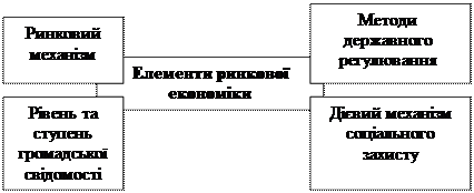 Рис.2.2. Основні засади ринку. Важливим елементом відтворення ринкового середовища є ринкова інфраструктура. Ринкова інфраструктура — це сукупність підприємств і організацій, які забезпечують рух товарів, грошей, цінних паперів, робочої сили тощо. До таких установ |належать: біржі, банки, дилерські та брокерські контори, служби зайнятості, оптові та постачально-збутові організації, інвестиційні компанії, страхові організації, аудиторські фірми тощо. Головним інструментом створення моделі ринку має бути не стихійна гра сил, активна й послідовна діяльність держави щодо створення необхідних інститутів ринкової економіки, яка включає такі основні елементи: ринковий механізм; методи державного регулювання; рівень та ступінь громадської свідомості; дієвий механізм соціального захисту населення (особливо на перехідному етапі) (рис.2.3).