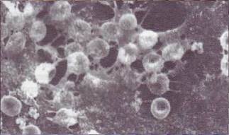 Образовавшийся фибриновый сгусток - трехмерная молекулярная сеть, в которую включены тромбоциты, эритроциты и лейкоциты (рис. 46). Активированные тромбоциты, связанные с нитями фибрина через рецепторы GPIIb-IIIa, сокращают-