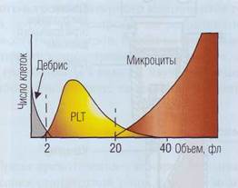 Рис. 75. Гистограмма тромбоцитов, которая изображается при представлении результатов счета клеток крови на гематологических анализаторах, Помимо гистограммы, гематологические анализаторы представляют результаты подсчета количества тромбоцитов (PLT), среднего объема тромбоцитов (MPV), дисперсии распределения тромбоцитов по объему (PDW), тромбоцитокрита (РСТ)