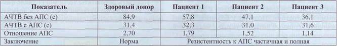 мальной и дефицитной по ф.V плазмы время свертывания в тесте АЧТВ удлиняется примерно в 2 раза. Если имеется РАПС, удлинение АЧТВ выражено в малой степени.