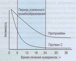 Рис. 116. Быстрое снижение протеина С, превышающее уменьшение витамин-К-зависимых факторов свертывания, может быть причиной возникновения тромботического состояния (рикошетные тромбозы) при начале лечения высокими дозами непрямых антикоагулянтов Обеспечение диагностики нарушений гемостаза в КДЛ