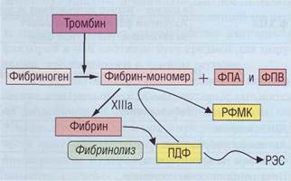 Рис. 128. Пул метаболитов фибриногена в норме. Из обозначенных продуктов в крови присутствует только сам фибриноген, Все остальные метаболиты находятся в исче-зающе малых количествах Рис. 129. Пул метаболитов фибриногена при ДВС-синдроме. Количество фибриногена снижается, появляются продукты деградации фибрина (ПДФ), фибринопептиды (ФПА и ФПВ), растворимые фибрин-мономерные комплексы (РФМК), РЭС - ретикулоэндотелиальная система Обеспечение диагностики нарушений гемостаза в КДЛ Таблица 34 Маркеры активации гемостаза