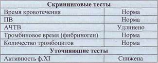 Дефицит фактора XI Дефицит фактора XI (ранее заболевание определялось как гемофилия С) - геморрагическое заболевание, возникающее из-за дефекта гена фактора XI. Дефицит фактора XI передается как аутосомно-рецессивный признак. Это заболевание достаточно часто встречается в популяции евреев-ашкенази, среди которых гомозиготное носительство составляет от 0, 1 до 0, 3%, а гетерозиготное - от 5, 5 до 11%. В других группах людей описаны лишь спорадические случаи. Клинически дефицит ф.ХI значительно отличается от гемофилии А и В, вследствие этого термин «гемофилия С» исключен из классификации. У больных с гомозиготной формой заболевания активность ф.ХI в крови составляет от 0 до 15%, у гетерозиготных носителей - от 25 до 70%о. При дефиците ф.ХI имеется умеренно выраженный геморрагический синдром в виде большого количества кожных геморрагических элементов, носовых, маточных кровотечений, длительных кровотечений после хирургических вмешательств, кровотечений после удаления зуба или тонзиллэктомии. В каждом конкретном случае трудно предсказать, как больной среагирует на хирургическое вмешательство. Тяжесть геморрагического синдрома может не коррелировать с активностью ф.ХI в крови. Клинические проявления возникают при остаточной активности ф.ХI менее 30%, однако возможны минимальные Патология гемостаза проявления у гетерозиготных носителей с активностью ф.ХI между 50 и 70%. Лечение. Для лечения геморрагических проявлений при дефиците ф.ХI используется свежезамороженная плазма. Разработаны и концентрированные очищенные препараты ф.ХI, которые применяются в некоторых странах. Лабораторная диагностика дефицита ф.ХI основана на проведении стандартных тестов ко-агулограммы и на определении активности ф.ХI в плазме (табл. 42). Таблица 42 Изменения лабораторных показателей при дефиците ф.Х1