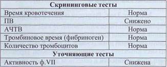 Врожденный дефицит фактора VII (гипопроконвертинемия) Геморрагическое заболевание, возникающее вследствие дефицита активности ф.VII в плазме (гипопроконвертинемия), передается как аутосомно-рецессивный признак. Литературных данных о распространенности этого заболевания практически нет, что, вероятно, связано с отсутствием клинических проявлений у многих пациентов с уровнем активности ф.VII выше 5%. При тяжелой форме с активностью ф.VII ниже 3% геморрагический синдром похож на проявления у больных тяжелой формой гемофилии А, включая эпизоды гемартрозов. Первые проявления могут возникать сразу после рождения: кровотечения из пупочного канатика, пупочной ранки, кефалогематомы, внутричерепные гематомы. В дальнейшем характерны кожные геморрагические проявления в виде множественных гематом и экхимозов, носовые, маточные кровотечения, длительные кровотечения после травм и хирургических процедур. Реже встречаются гематомы мягких тканей. Тяжесть геморрагических проявлений коррели- рует с активностью ф.VII. С целью коррекции гемостаза при дефиците ф.VII может вводиться свежезамороженная плазма, концентраты факторов протромбинового комплекса. Имеется очищенный концентрат ф.VII. Лабораторная диагностика дефицита ф.VII основана на изменении стандартных тестов коа-гулограммы и на определении активности ф.VII (табл. 43). Таблица 43 Изменения лабораторных показателей при дефиците ф. VII