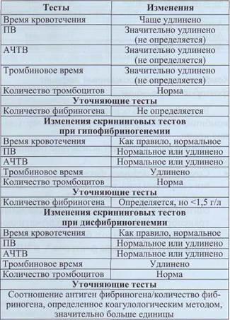 Афибриногенемия, гипофибриногенемия и дисфибриногенемия Наследственные количественные и качественные нарушения фибриногена, приводящие к развитию геморрагических или тромботических состояний, встречаются достаточно часто. В этом разделе коротко представлены геморрагические заболевания, связанные с нарушением синтеза фибриногена. Афибриногенемия - редкое аутосомно-рецес-сивное заболевание, которое проявляется частыми клинически значимыми кровотечениями, в том числе кровотечениями из пуповинного остатка, гемартрозами, кровоизлияниями в мозг, формированием гематом мягких тканей, выраженным кожным гемосиндромом, кровотечениями из слизистых. Отсутствие фибриногена плазмы не всегда сочетается с дефицитом фибриногена ос-гранул тромбоцитов, поэтому тромбоцитарный тромб может формироваться. О состоянии гипофибриногенемии говорят в том случае, если содержание фибриногена в плазме менее 1 г/л. Клинические проявления аналогичны проявлениям при афибриногенемии, однако менее выражены. Диагноз дисфибриногенемий соответствует состоянию, при котором изменена структура фибриногена, однако содержание самого белка в крови (антигена) нормальное или снижено непропорционально функции. Дисфибриногенемий могут проявляться кровотечениями, тромбозами или не иметь никаких проявлений. Клинические проявления геморрагических дисфибриногенемий сходны с проявлениями гипофибриногенемии. Лабораторная диагностика количественных и качественных нарушений фибриногена основана на изменении стандартных тестов коагулограммы (табл. 47). Для установления диагноза дисфибриногенемий показано проведение дополнительных тестов. Часто этот диагноз можно поставить только после исследования гена ф.I. Таблица 47 Изменение скрининговых тестов при афибриногенемии