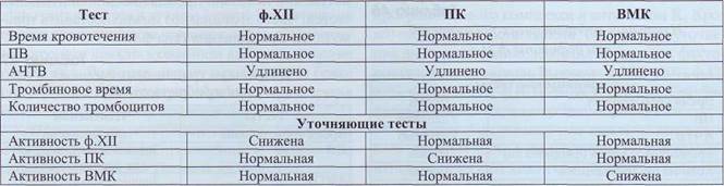 Дополнительным тестом, позволяющим по косвенным признакам заподозрить дисфибрино-генемию, является тромбоэластография. Дефицит факторов контактной активации Дефицит ф.ХII, прекалликреина (ПК) и высокомолекулярного кининогена (ВМК) нельзя в полной мере отнести к геморрагическим заболеваниям. Дефицит активности ВМК или ПК клинически никак не проявляется. У пациентов с дефицитом ф.ХII (болезнь Ха-гемана) имеются разнонаправленные тенденции. У большинства из них, даже при глубоком дефи- ците, нет геморрагических проявлении, однако у некоторых пациентов этой группы имеет место повышенная кровоточивость. Некоторые пациенты с дефицитом ф.ХII имеют тенденцию к тром-ботическим проявлениям. Распространенность дефицита ф.ХII в популяции довольно высока. Большинство случаев удлинения АЧТВ у пациентов без клинических проявлений связано с этой патологией. По некоторым данным частота гетеро- и гомозиготных форм дефицита ф.ХII в популяции достигает 1, 5-3%. Лабораторные данные при дефиците ф.ХII, ПК, ВМК представлены в табл. 48. Таблица 48 Изменения скрининговых тестов при дефиците факторов контактной активации
