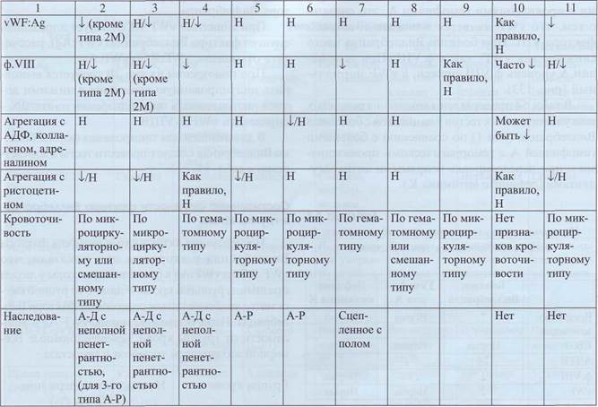 vWF: Ag - антиген фактора Виллебранда, vWF: RCo - коллаген-связывающая активность фактора Виллебранда, ф.VIII - фактор коагуляции VIII, А-Д - аутосомно-доминантное, А-Р - аутосомно-рецессивное.
