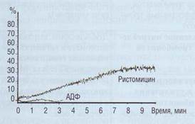 Рис. 134. Агрегация тромбоцитов у больной с иммунной тромбоцитопенией. Агрегация тромбоцитов с АДФ (0, 625 мкмоль/л) составляет всего 1, 5% (норма 24-40%), быстро развивается дезагрегация, Агрегация тромбоцитов с ристомицином также снижена - 30% (норма 48-91%)