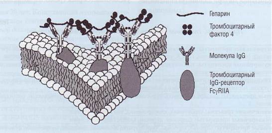 Рис. 135. Активация тромбоцитов гепарином за счет образования на поверхности мембран мультимолекулярного комплекса между гепарин-зависимыми lgG-антителами и тромбоцитарным фактором 4 Патология гемостаза