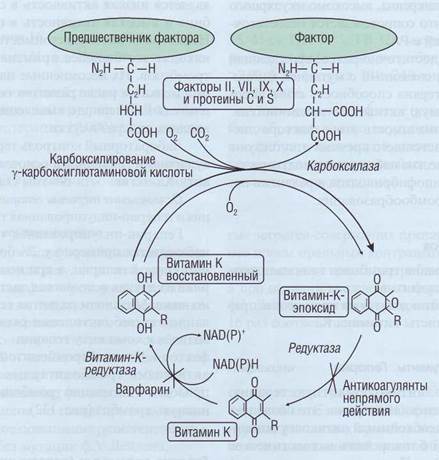 Патология гемостаза длительной профилактики тромбозов у пациентов с протромботическими состояниями. Механизм действия. Антикоагулянты непрямого действия блокируют в клетках печени конечный этап синтеза (γ -карбоксилирование) ви-тамин-К-зависимых факторов VII, X, IX, протромбина, а также двух антикоагулянтов - протеинов С и S. Эти препараты действуют как конкурентные ингибиторы витамин-К-редуктазы и витамин-К-эпоксидредуктазы (рис. 142). Под влиянием антикоагулянтов непрямого действия образуются неактивные белковые молекулы факторов VII, X, IX и II PIVKA (PIVKA Proteins Induced by Vitamin K Absence or Antagonists) -протеины, индуцированные отсутствием витамина К или наличием его антагонистов. PIVKA обладают теми же иммунологическими свойствами и аминокислотным составом, что и активные факторы, но не способны участвовать в процессе свертывания крови. Наиболее корректное название для PIVKA-белков - акарбоксибелки. В результате формирования акарбоксибелков снижается интенсивность активации протромбина и соответственно риск развития патологического тромбоза. Гипокоагуляция при использовании антагонистов витамина К развивается медленно, эти препараты отличаются продолжительным действием и обладают кумулятивным эффектом. Скорость снижения концентрации витамин-К-зависимых факторов зависит от периода их циркуляции в организме: сначала уменьшается содержание фактора VII (время полувыведения -t1/2 = 4-6 ч), затем IX (t1/2 = 15-30 ч), X (t1/2 = 24-40 ч) и протромбина (t1/2 = 48-96 ч). Через 4-7 дней концентрация витамин-К-зависимых факторов