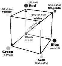В основе лежат излучаемые цвета: красный (RED), зеленый (GREEN), синий (BLUE). Остальные цвета образуются при смешении этих трех основных. Основные цвета принято называть компонентами или каналами. Количество каждой компоненты в цвете определяется числом от 0 до 255.