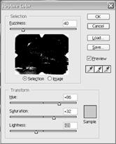 3. для удаления цветов из выделенной области используют " пипетку с -" 4. создав выделение, изменить цвет, настраивая Hue (Цветовой тон), Saturation Насыщенность) и Lightness (Яркость). 5. нажать " OK".