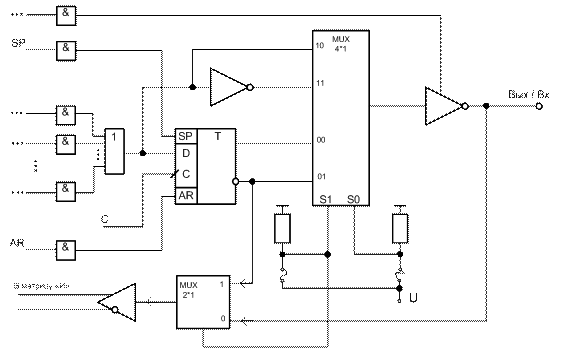 Макроячейка содержит синхронный D-триггер с цепями асинхронного сброса AR и синхронной установки SP. Сигналы AR и SP вырабатываются специальными термами матрицы «И». Мультиплексор 4*1 через буферный усилитель подключен к выходу, а мультиплексор 2*1 передает сигналы обратной связи в матрицу «И». Мультиплексор 4*1 может быть запрограммирован на подключение к выходу прямого или инверсного сигнала от логической части ПМЛ или прямого или инверсного сигнала с выходов триггера. Мультиплексор 2*1 может быть запрограммирован на подключение к матрице «И» сигнала обратной связи с выхода ПМЛ или с инверсного выхода триггера. Программируются мультиплексоры с помощью плавких перемычек. При установке внешнего буферного усилителя в третье состояние внешний вывод может использоваться как вход. Каждый из десяти выходов микросхемы PALC22V10D снабжен такой макроячейкой, поэтому любой из них может быть запрограммирован на требуемую полярность выходной функции (инверсное или прямое значение), комбинационный или триггерный, двунаправленный или обычный тип выхода.