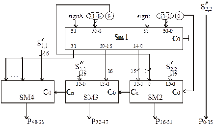Частичные произведения Si, j можно получить на БИС 16-разрядных умножителей, то есть для получения 64-разрядного произведения потребуется 4 умножителя. Если необходимо получить m-разрядной результат m=32 путем отбрасывания младшей части произведения то достаточно трех умножителей, так как не потребуется Структурная схема блока сложения для 64-разрядного результата будет иметь вид: