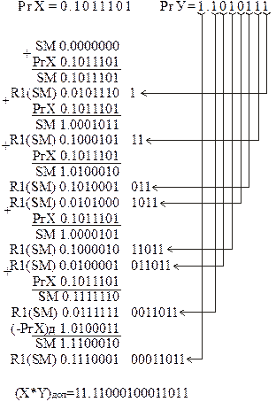 Рассмотрим как выполнялось бы умножение, если бы оно реализовывалось на 4-разрядных умножителях. Множители Х, У разбиваются на части: X=0101|1101 Y=1101|0111 а)S1, 1=0.101*1.101=11.110001 б) S1, 2=0.101*0111=0.0100011 в)S2, 1=1101*1.101=1.1011001 г) S2, 2=1101*0111=01011011