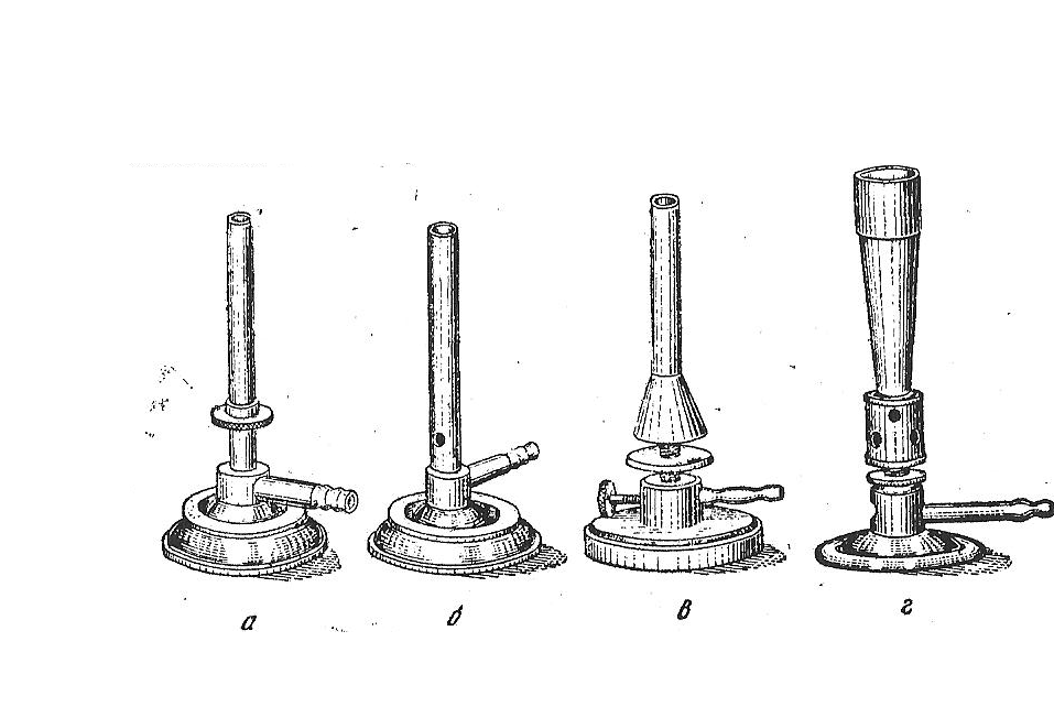 42 - сурет Газды қ ыздыру қ ұ рылғ ылары. Газды жанарғ ылар– зертханада кең қ олданылады. Олардың Бунзен жә не Теклю газ жанарғ ысы деп аталатын екі тү рі бар.Сонымен бірге Меккер газ жанарғ ысы да жиі қ олданылады. Газды жанарғ ылар кү йелі жарқ ырағ ан жалынмен («суық») жә не жарқ ырамайтын жалынмен де («ыстық») жанады. Газ жанарғ ының тө менгі бү йір бө лігінен келіп, жанарғ ығ а газ шү мегін ашқ аннан кейін ғ ана келеді. Бунзен жанарғ ысында оның тө менгі бү йір бө лігінен жоғ арылау жерде ауа келіп тұ руын қ амтамассыз ететін 2 тесік қ уыс болады. Ауа еркін, жеткілікті келіп тұ рса, жарқ ырамайтын кө гілдір жалынмен, ал ауа аз келсе, кү йеленіп жанады. Бунзен жанарғ ысының 2 типі болады: 1) ауа ағ ынын реттегіші бар жә не реттегіші жоқ жанарғ ылар. Реттегіші бар Бунзен жанарғ ысында реттеуіш гильза болады. Оны бұ рау немесе мү лде жабу арқ ылы ауа ағ ынын бақ ылап, кү йелі жалынды, ал гильзаны ашу арқ ылы ә р тү рлі кө лемдегі ішкі конусты жарқ ырамайтын жалынды алуғ а болады.