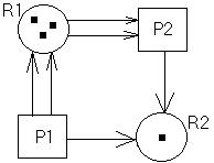 В некоторый момент времени P1 запрашивает 2 единицы R1 и запрашивает 1 единицу R2. P2 – запрашивает 1 единицу R2 и владеет 2 единицами R1. Каждому процессу нужны все требуемые ресурсы, чтобы он мог продолжить выполнение. Предположим, что процесс Р1 получил бы теперь запрошенную им единицу R2. Если удовлетворить запрос Р1 на ресурс R2 это может привести к тупиковой ситуации. P1 не сможет продолжиться до тех пор, пока Р2 не освободит единицу ресурса R1, а процесс Р2 не сможет продолжиться до тех пор, пока Р1 не освободит единицу R2. Если не удовлетворить Р1 – отдать Р2 – он завершится. Пример тупика двух конкурирующих процессов.