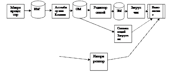 При разработке программ, используется принцип модульности (разбиения программы на составные части), каждая из которых может подготавливаться отдельно. Модульность является основным инструментом структурирования программного изделия, облегчающим его разработку, отладку и сопровождение. Программный модуль - программа или функционально завершенный фрагмент программы, предназначенный для хранения, трансляции, объединения с другими программными модулями и загрузки в оперативную память. При выборе модульной структуры должны учитываться следующие основные соображения: o Функциональность - модуль должен выполнять законченную функцию o Несвязность - модуль должен иметь минимум связей с другими модулями, связь через глобальные переменные и области памяти нежелательна o Специфицируемость - входные и выходные параметры модуля должны четко формулироваться. От написания до выполнения программа проходит следующие этапы: 1. Обработка макропроцессором 2. Трансляция 3. Редактирование связей (компоновка) 4. Загрузка. На рисунке показаны перечисленные этапы и используемые для их выполнения системные обрабатывающие программы.