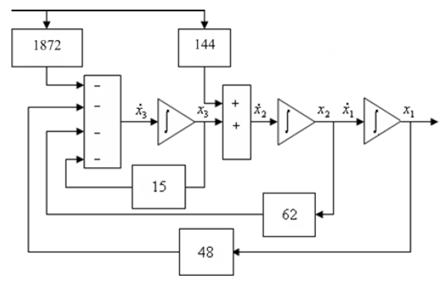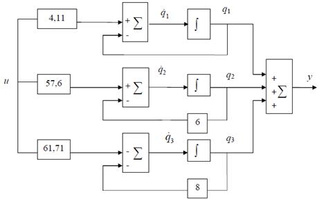 Элементы матриц B и D вычисляются по рекуррентным соотношениям. Подставив в (3) рассчитанные матрицы, получим систему дифференциальных уравнений 1-го порядка. На основе полученной системы строим схему модели, например:
