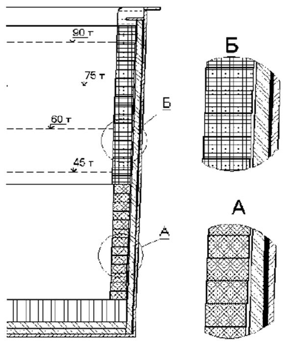 После прогрева по высоте ковша рабочий слой футеровки имеет практически однородную температуру. Температура стенок нижней части ковша более высокая (на 30-50 0С), чем средней и нижней. Днище ковша прогревается равномерно, но температурный градиент в первом огнеупорном слое в 2 раза выше, чем для стен. Основное падение температуры происходит в изоляционном слое футеровки. Сравнивается расчетное значение температуры с измеренным в характерных точках на ковше после его прогрева. Не существенные расхождения свидетельствует о том, что температурная деформация огнеупоров не приведет к образованию трещин. После подготовки ковша рабочий слой футеровки имеет практически однородную температуру по всей высоте ковша. Наполнение первой порцией жидкой стали вызывает резкий перепад температуры в огнеупорах первого слоя футеровки, который может вызвать зарождение трещин в радиальном направлении. При заполнении ковша порциями меньше номинальной вместимости в первом слое футеровки стен для верхней и средней части возникает значительный температурный градиент в вертикальном направлении, что может привести к возникновению вертикальных трещин. Добавление последующих порций вызывает перепады температуры в футеровке средней части ковша. Для случая наполнения ковша первой порцией малого объема отмечается большие перепады температуры. Дальнейшие операции подогрева стали и длительной выдержки приводит к выравниванию температур по слоям футеровки, что замедляет процесс образования трещин или их увеличение.