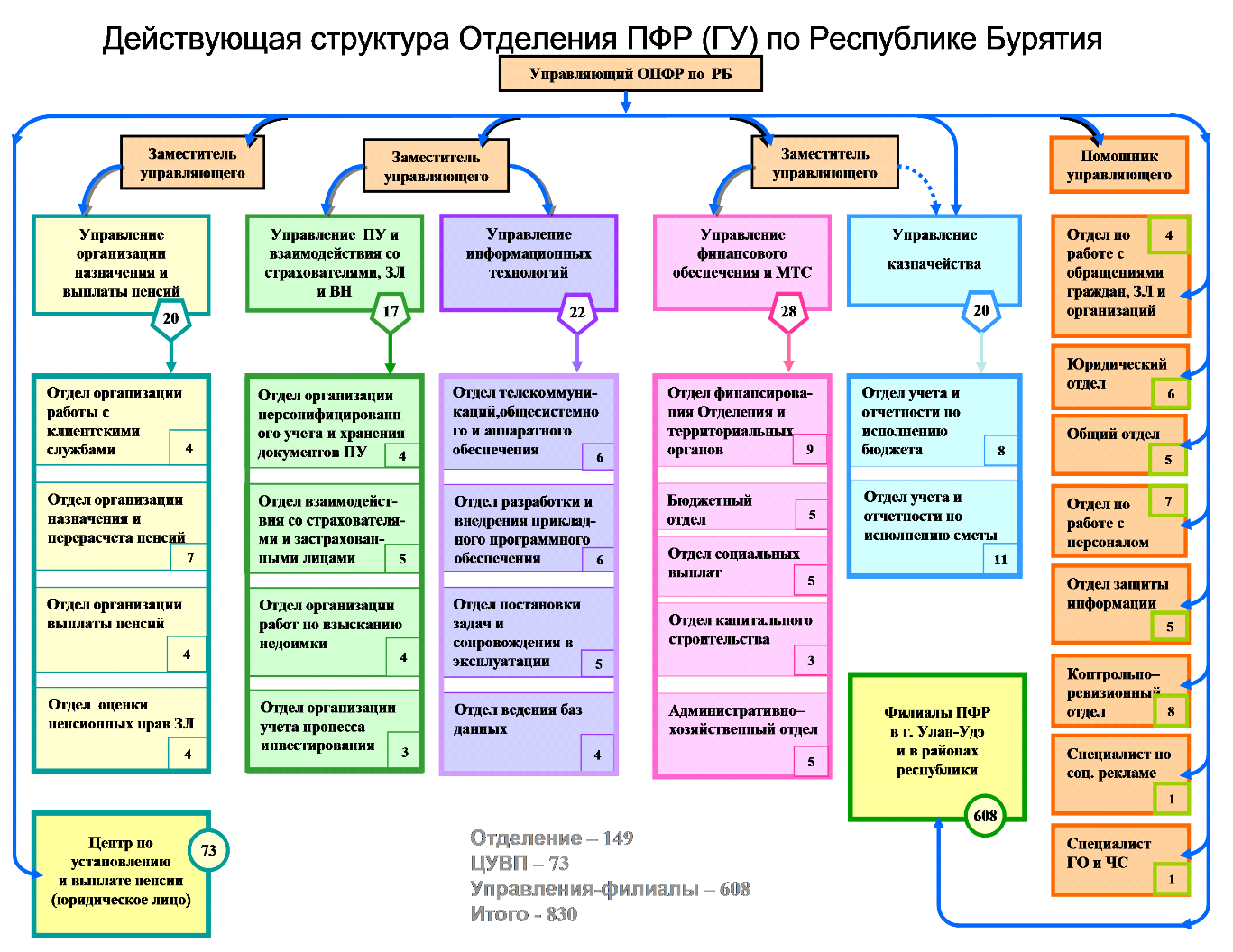 Бурятия было создано в марте 1991 года. Отделение Пенсионного фонда РФ по Республике Бурятия решает важные государственные задачи по своевременному пенсионному обеспечению тысяч своих земляков. Отделение Пенсионного фонда РФ по РБ имеет следующую структуру управления: